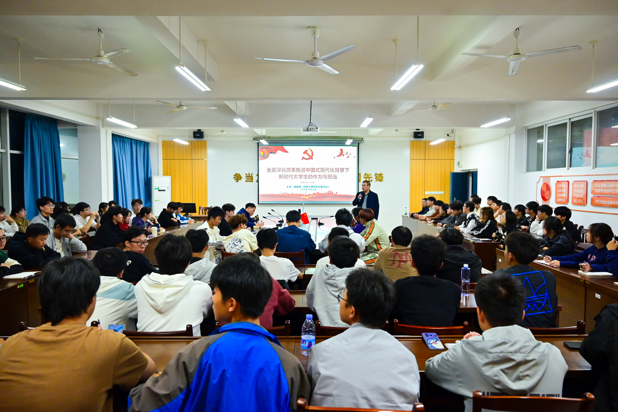 为深入学习贯彻党的二十届三中全会精神,10月28日晚,2138cn太阳集团古天乐在巡天楼229会议室举办2024年秋季学期第一期思政大讲堂。此次大讲堂以《全面深化改革推进中国式现代化背景下 新时代大学生的作为与担当》为主题,由学院党委书记谢雄辉主讲,100余名师生聆听。