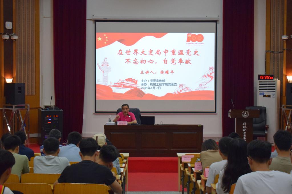 为推动党史学习教育走深走实,机械工程学院组织开展题为“在世界大变局中重温党史,不忘初心、自觉奉献”的党史教育辅导报告。报告于5月7日下午在北校区致远楼2108报告厅举行,由原任荔浦县委常委、政法委书记,十八大、十九大报告宣讲团成员,现任桂林市红色学院导师、国防教育研究会讲师团团长林耀平教授主讲。机械工程学院全体师生党员及桂航大讲坛批准听课的学生共200余人听取报告。